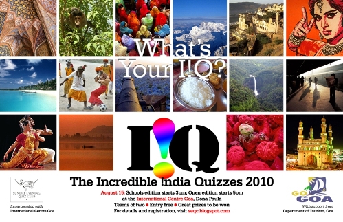 Incredible India Quiz was held in two categories – School Edition (upto 12 Std. students) and Open Quiz (open for all) on 15th August 2010.The quiz was orgainised in association with Sunday Evening Quiz Club (SEQC) in partnership with Ministry of Tourism, Government of Goa. Poster
