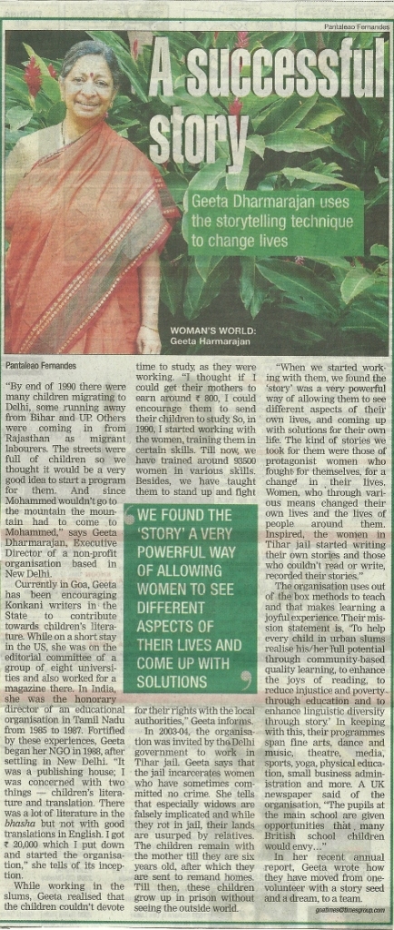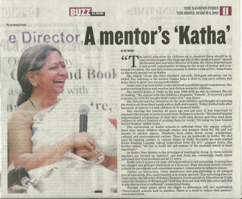 Interactive Session with Geeta Dharmarajan was held on 1 March 2011. The session was orgainised by Goa Writers Group and Bookworm in association The International Centre Goa. Geeta Dharmarajan is one of the best-known activists in multiple fields associated with education, translation, publishing, and universal literacy. She is the Founder and Executive Director of Katha, a non-profit organization working in the areas of formal and non-formal education, publishing and pro-poor activities. Media Coverage – Times of India 3 March 2011 | Navhind Times 3 March 2011