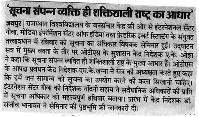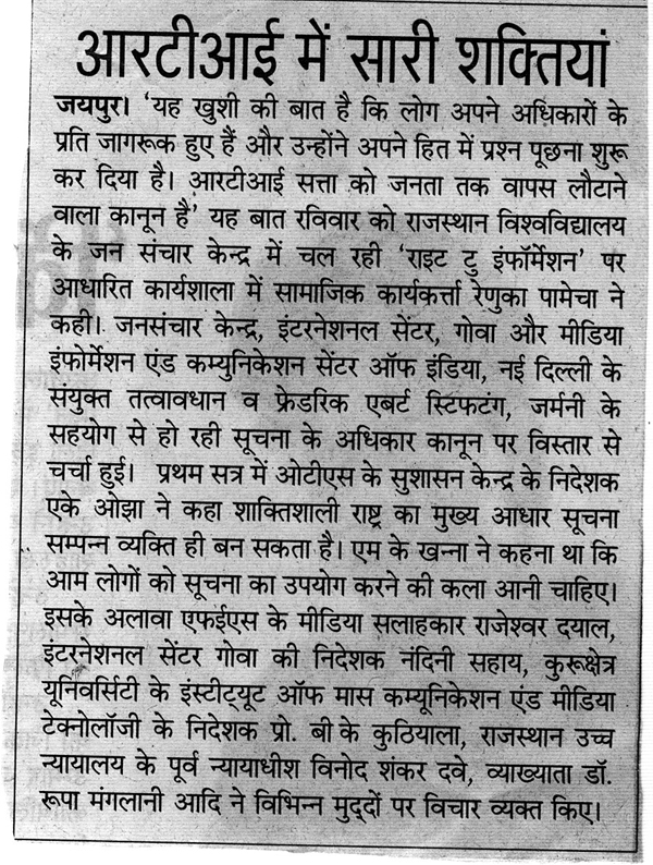 Regional Seminar on Right to Information jointly orgainsed by Centre for Mass Communication, University of Rajasthan – Jaipur, International Centre Goa and Media Information & Communication Centre of India, New Delhi in collabration with Friedrich Ebert Stiftung, Germany at Centre for Mass Communication Rajasthan – Jaipur. Programme | Press Report 1 | Press Report 2