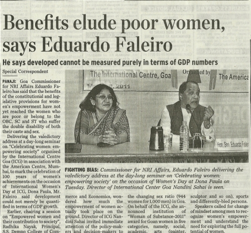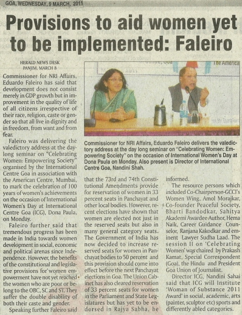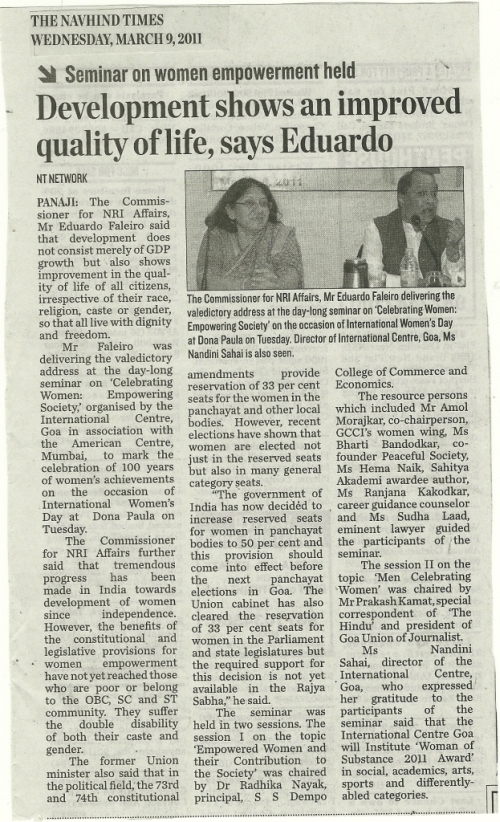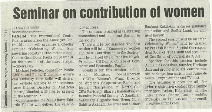 One day seminar on “Celebrating Women: Empowering Society” on occasion of the International Women’s Day was held on 8 March 2011. The seminar was orgainised by International Centre Goa in association with the American Centre, Mumbai. Michael Pelletier, counseller, Public Affairs and Public Diplomacy, American Embassy, New Delhi delivered the keynote address. Programme | Media Coverage – Gomantak Times 7 March 2011 , Navhind Times 8 March 2011 , Herald 8 March 2011 , Hindu 8 March 2011 | Photo Gallery