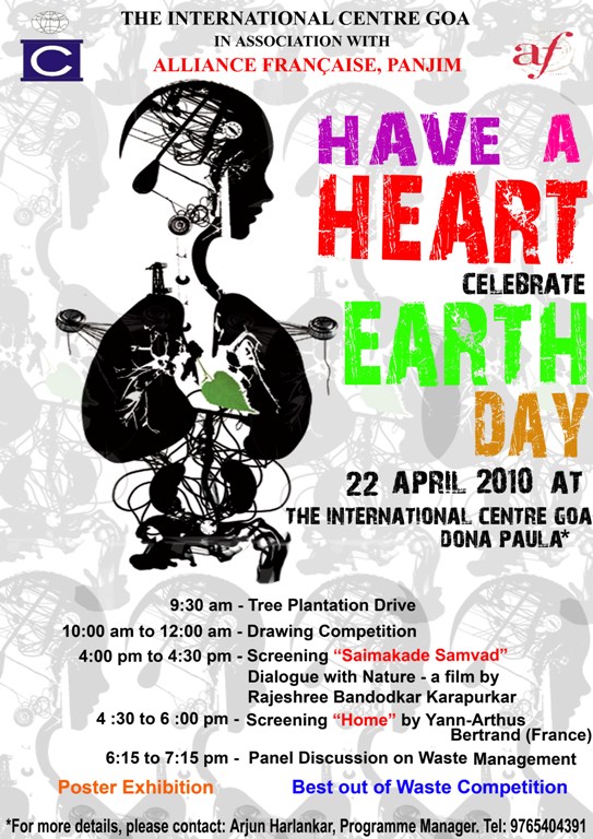 The International Centre Goa and Alliance Française, Panjim organised the Earth Day on Thursday, 22nd April 2010 at The International Centre Goa – Dona Paula, Goa . Photo Gallery | Programme | Poster