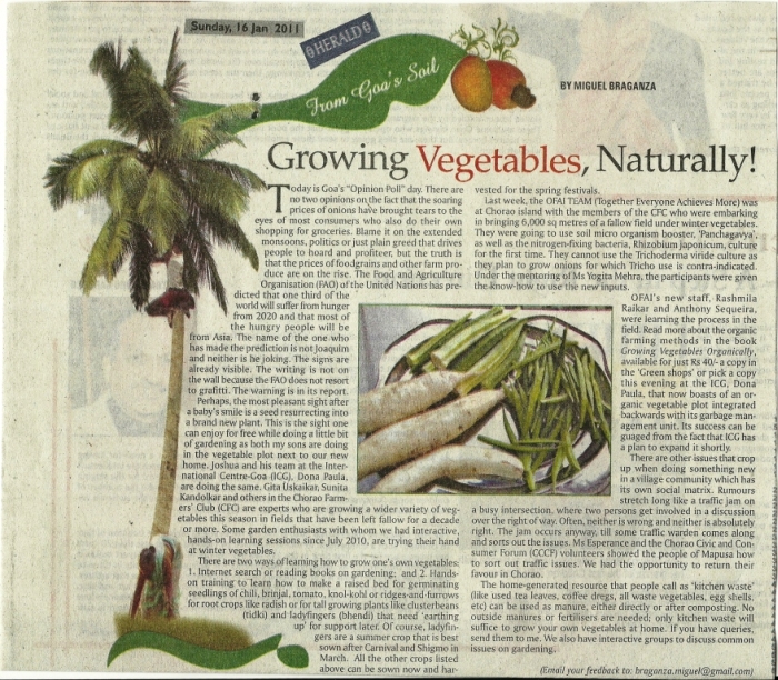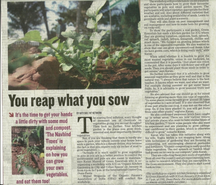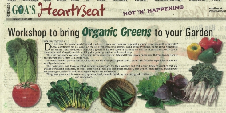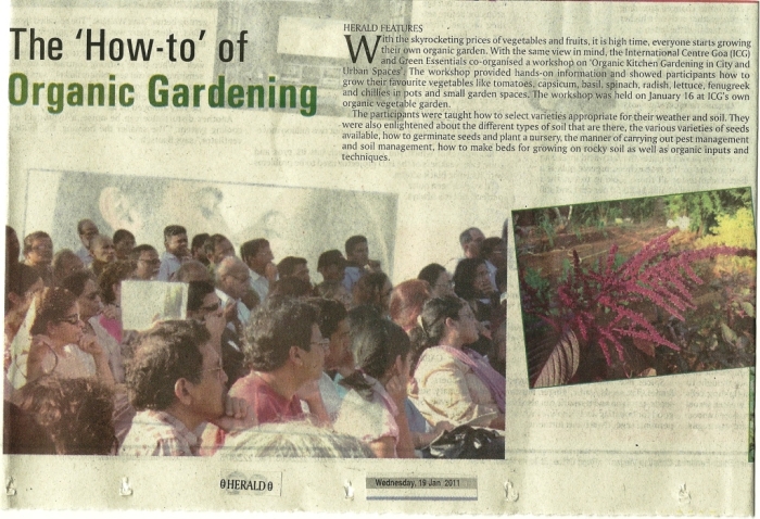 The International Centre Goa and Green Essentials co-organised workshop on Organic Kitchen Gardening in City & Urban Spaces. The workshop provided hands-on information and showed participants how to grow their favourite vegetables like tomatoes, capsicum, basil, spinach, radish, lettuce, Fenu Greek and chilies in pots and small garden spaces. The workshop was held in our own organic vegetable garden – Shaak Baag on 16 and 23 January 2011. Media Coverage – Herald – 15 Jan 2011| Hearld – 16 Jan 2011 | Herald – 19 Jan 2011 | Navhind Times – 15 Jan 2011